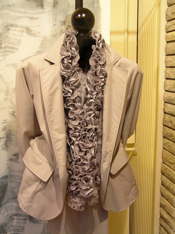 Blazier en algodón satinado combinado con pantalón tipo capri del mismo tejido en gris perla todo de KLEYMAC. Y completamos el conjunto con blusa estampada en colores gris y rosa pastel con gran detalle de volantes.